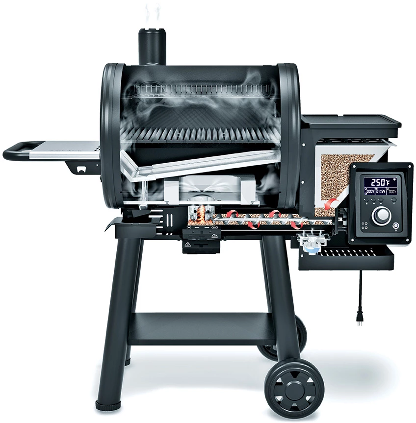 Auf Knopfdruck können Sie auf dem Regal 400 Pelletsmoker Brisket oder Ribs räuchern, Pizza backen, Steaks perfekt grillen oder auf der mitgelieferten Rotisserie einen Braten oder Hähnchen garen.
