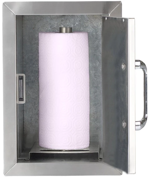 Mit dem BULL Einbau Küchenrollenhalter ist Küchenpapier in der Außenküche stets in Griff-Reichweite und trotzdem gut und sicher verstaut.