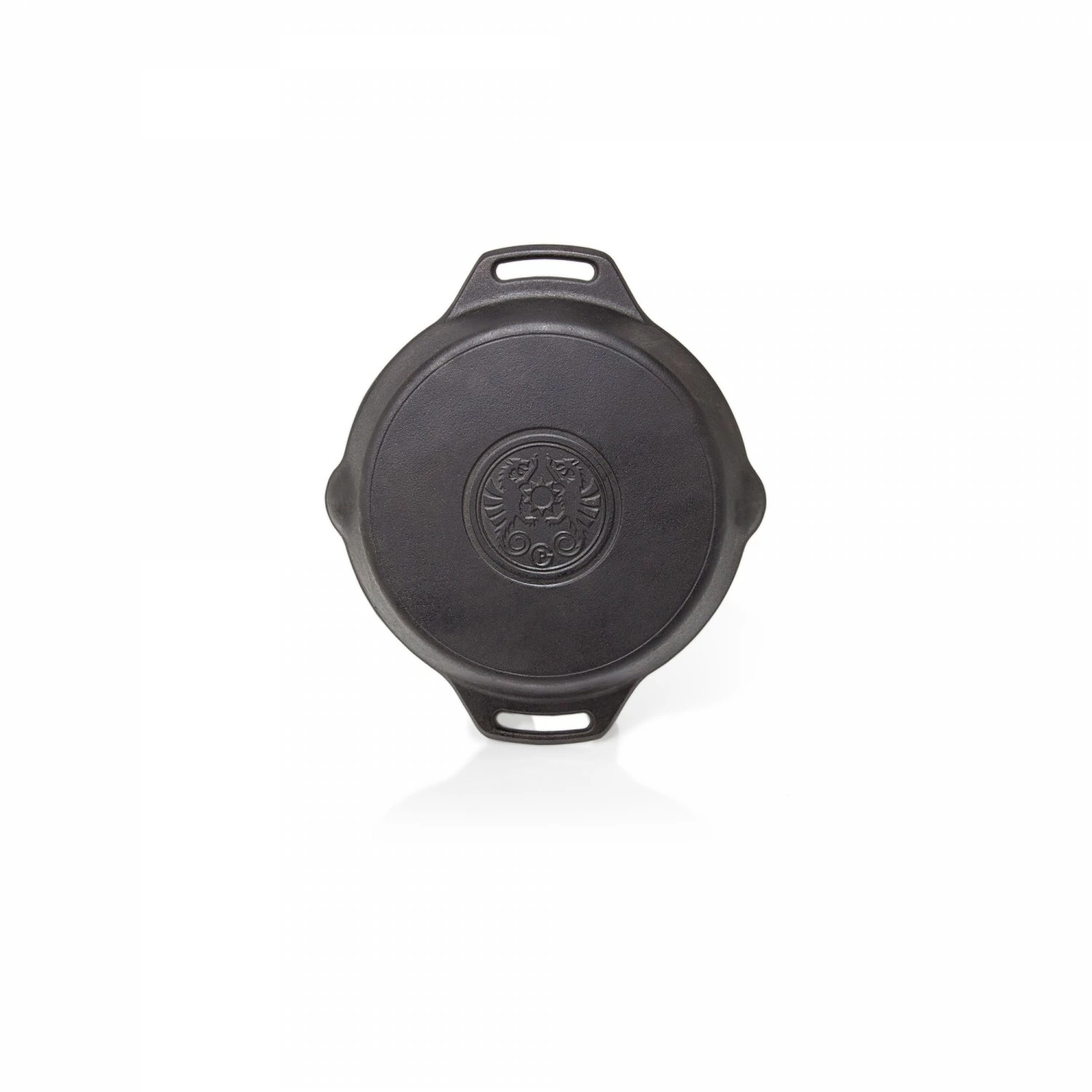 Die Gusseisenpfanne besitzt für ein sicheres Handling zwei Henkel sowie zwei Schüttnasen zum einfachen Abschütten des Inhaltes ohne Kleckern.
