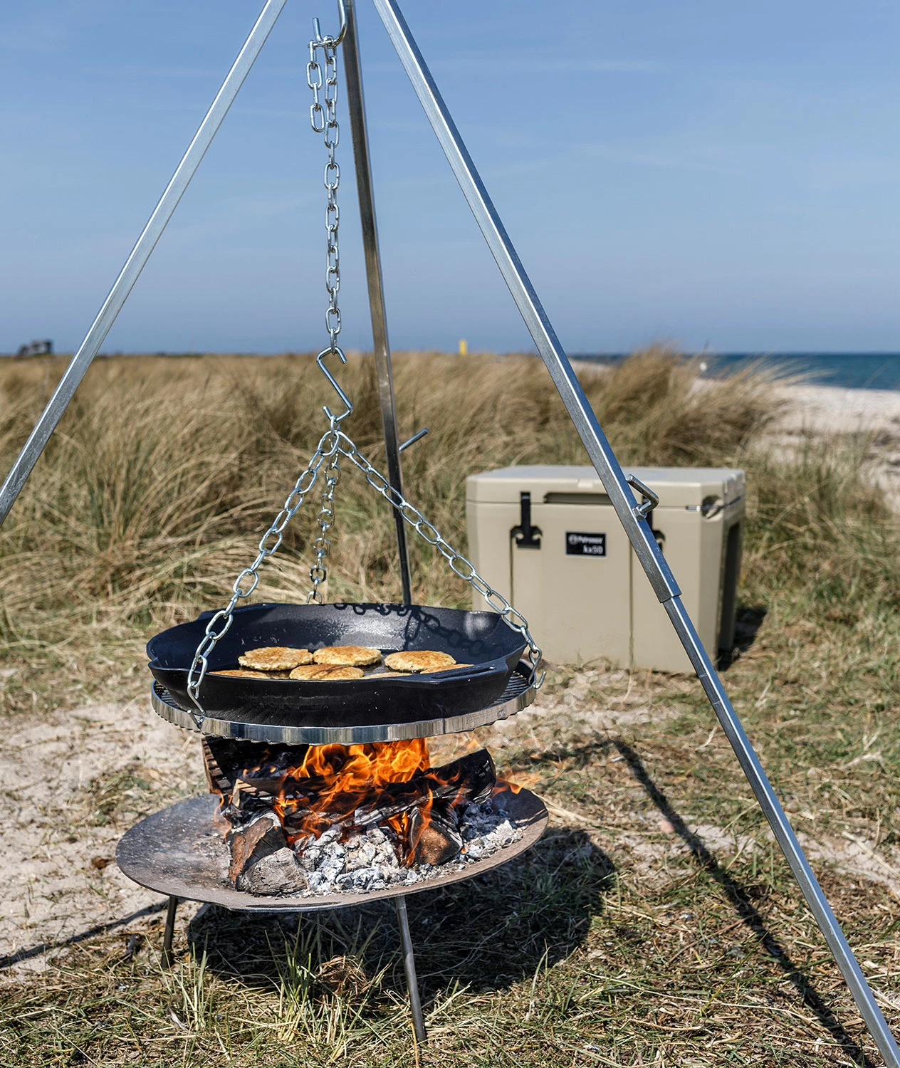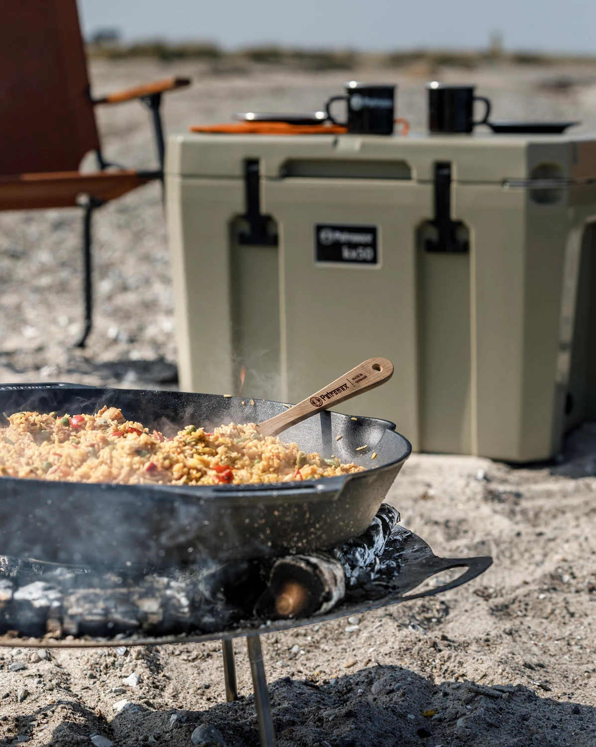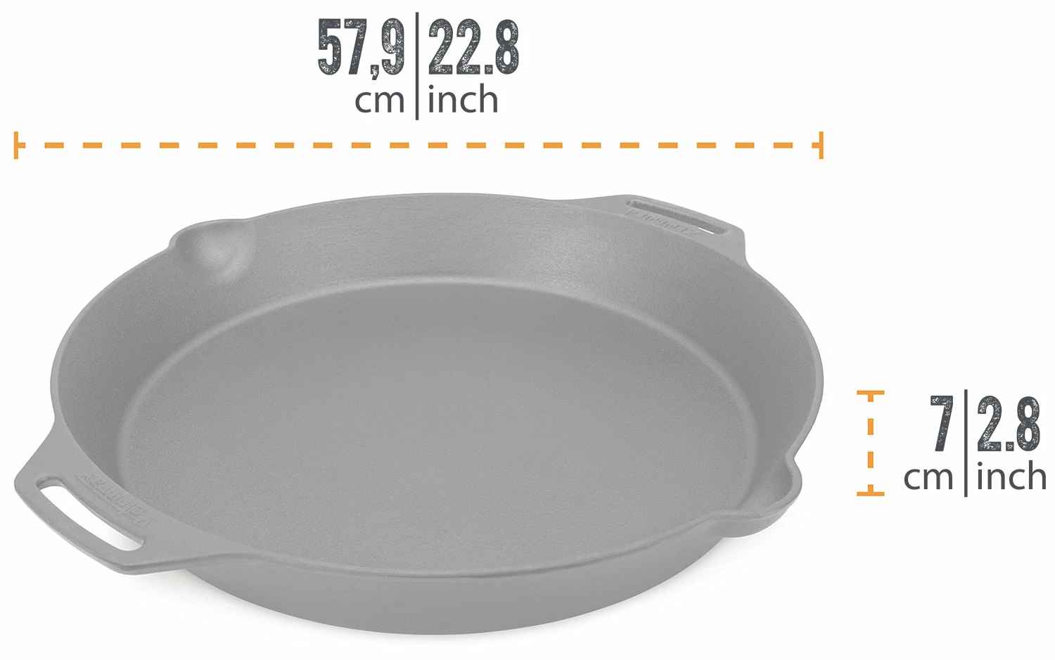 Die massive Petromax Gusseisenpfanne fp50h-t ist mit einem 5 cm hohen Rand ausgestattet und bietet mit einem Durchmesser von 50 cm ein maximales Volumen von 10,7 Litern. Das sollte selbst für eine Großfamilie ausreichen.