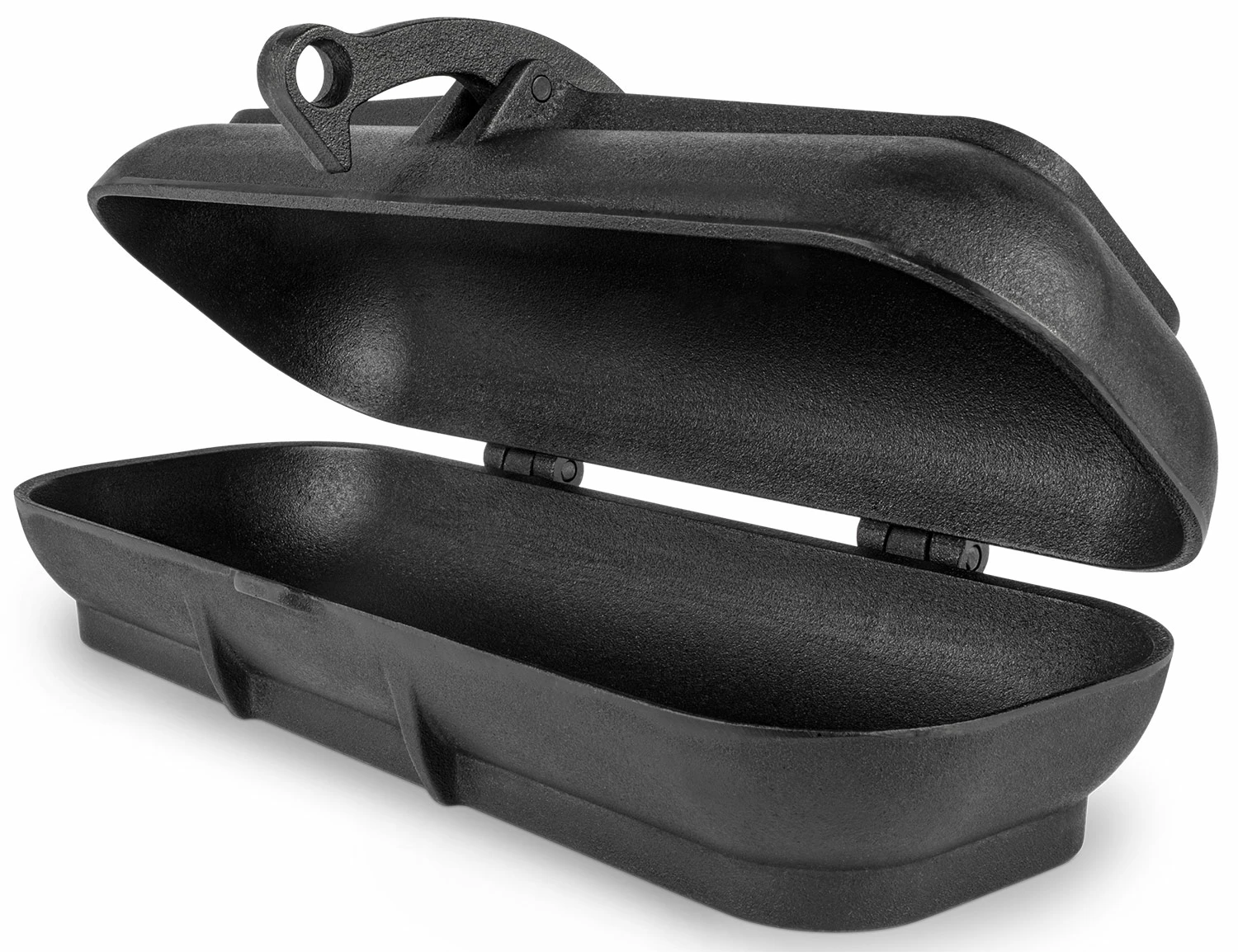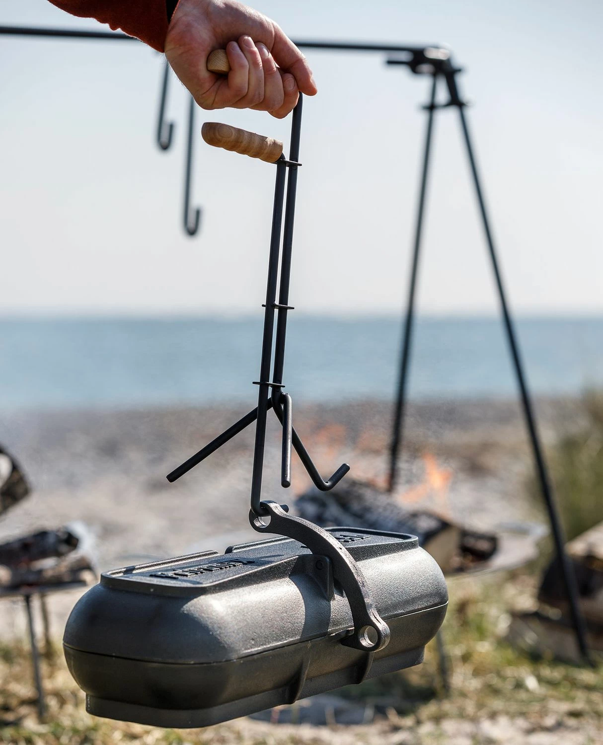 Durch einen ausgeklügelten Kippriegel-Mechanismuss lässt sich der Gussbräter sicher verschließen und gleichzeitig ganz leicht aus dem Feuer nehmen. Dazu wird einfach in die obere Öse des Riegels ein Deckelheber eingehakt. Der Riegel hält beim Anheben den Deckel geschlossen, so dass der Inhalt nicht herausfallen kann. Zum Öffnen des Deckels einfach den Deckelheber in untere Öse des Riegels einhaken.