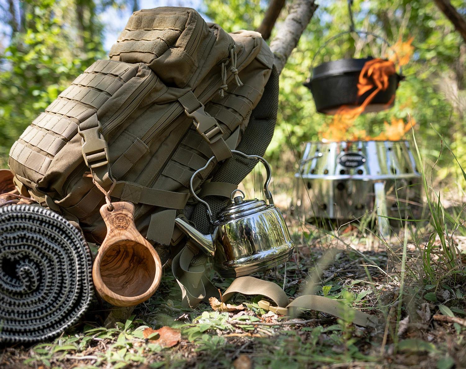 Eine angenehme und sichere Handhabung ermöglicht der dreifach gebogene, austarierte Henkel, mit dessen Hilfe sich der Kessel auch problemlos über einer Feuerstelle aufhängen und zum Transport am Rucksack befestigen lässt.